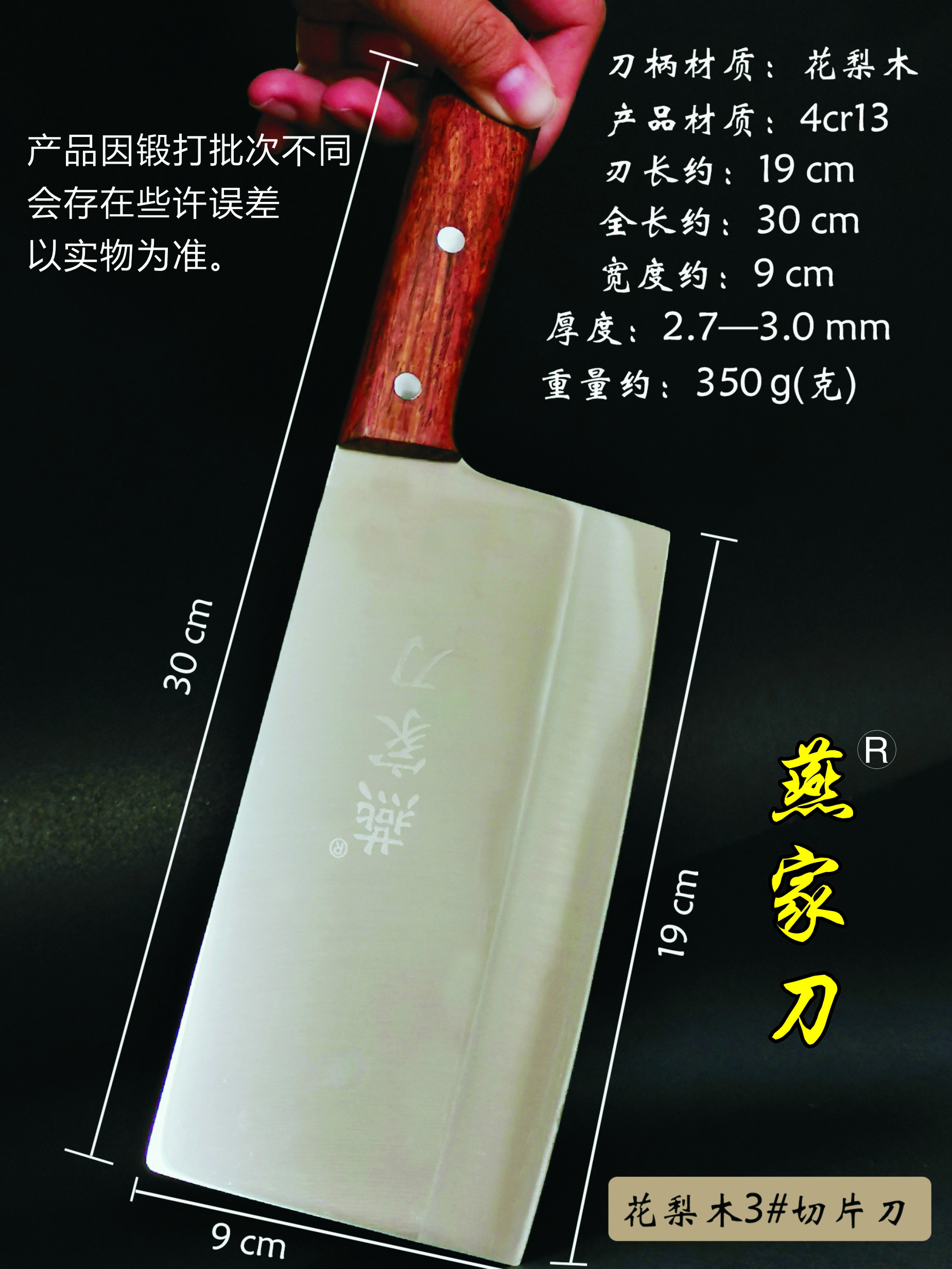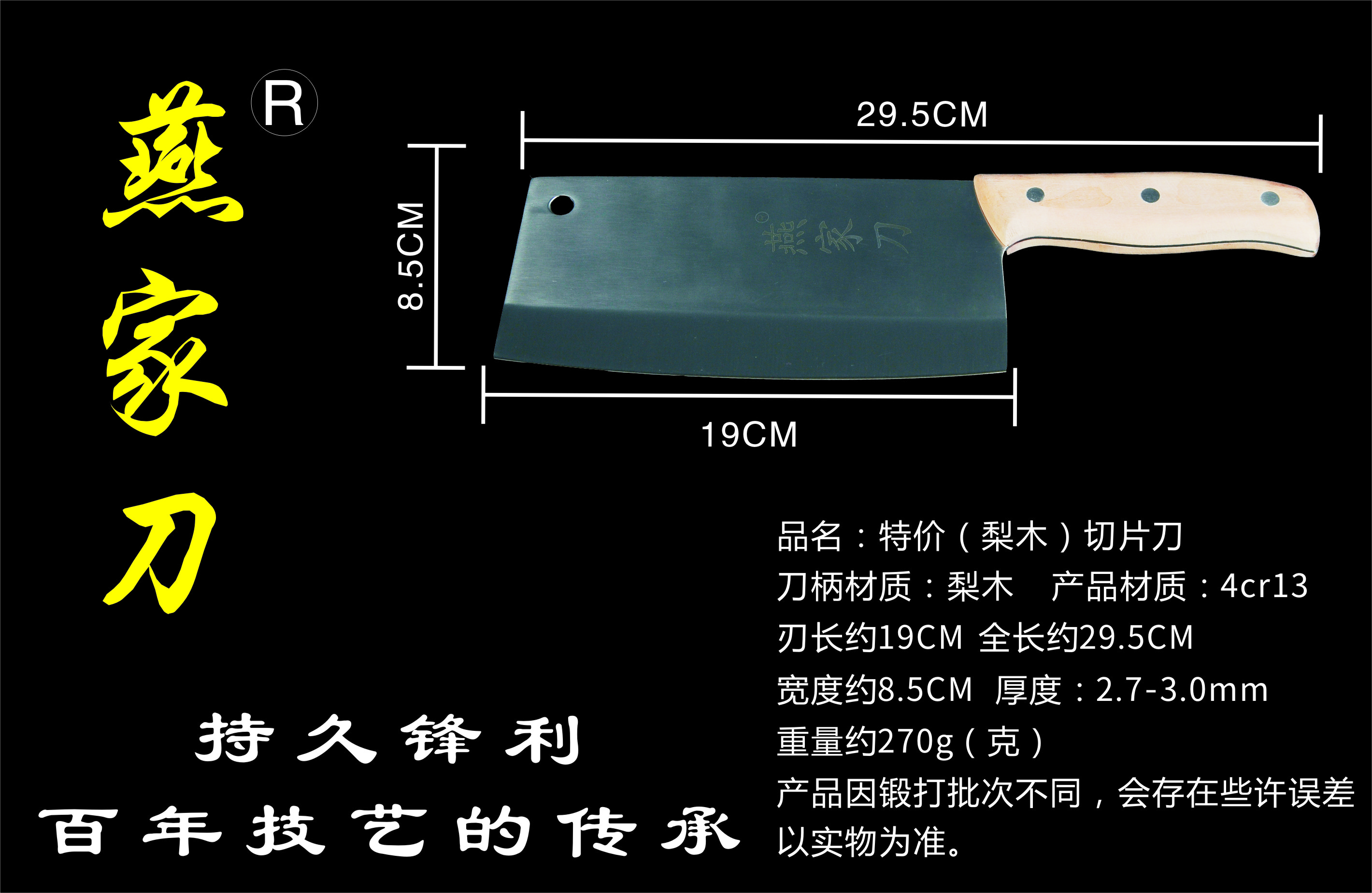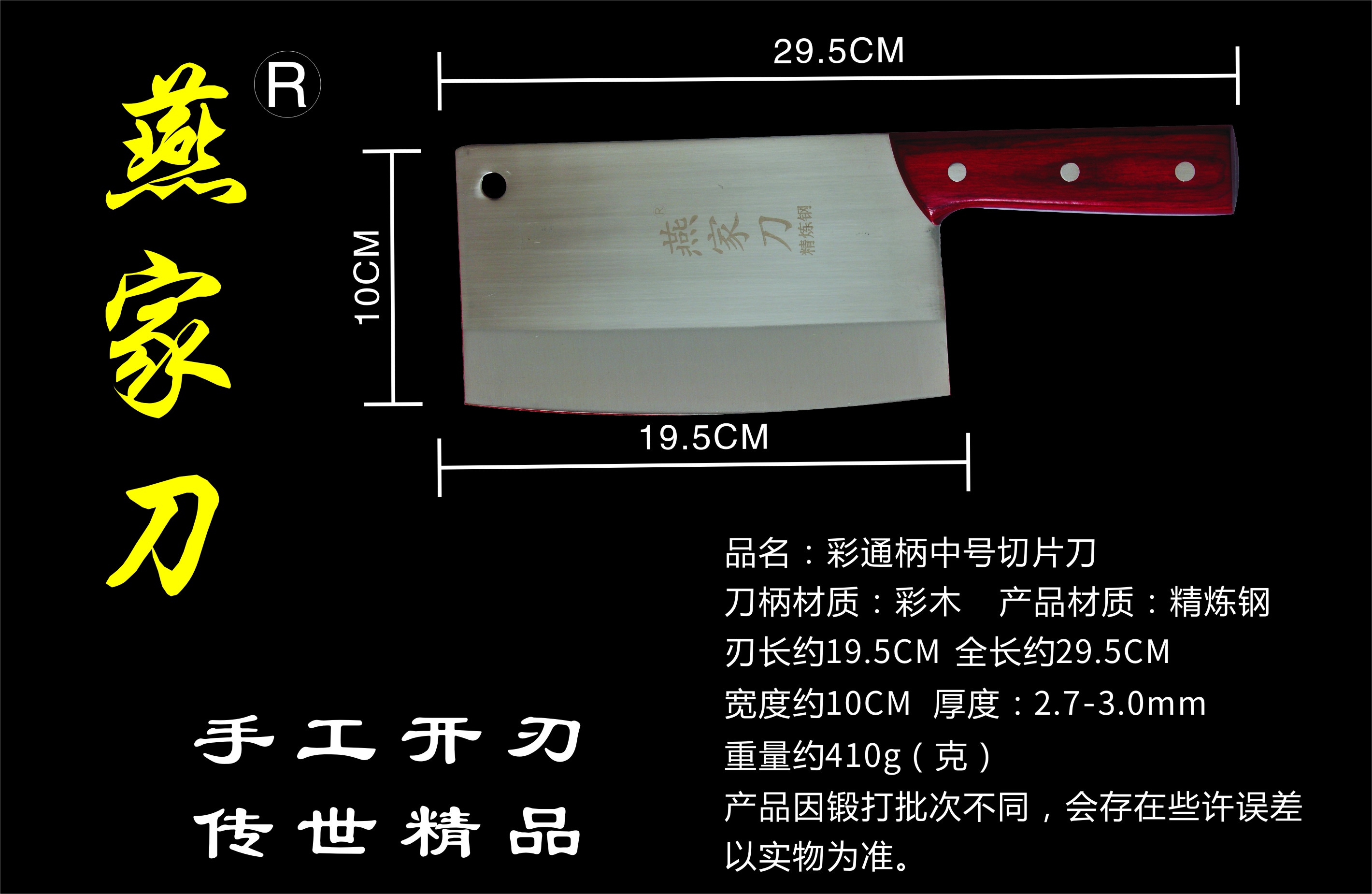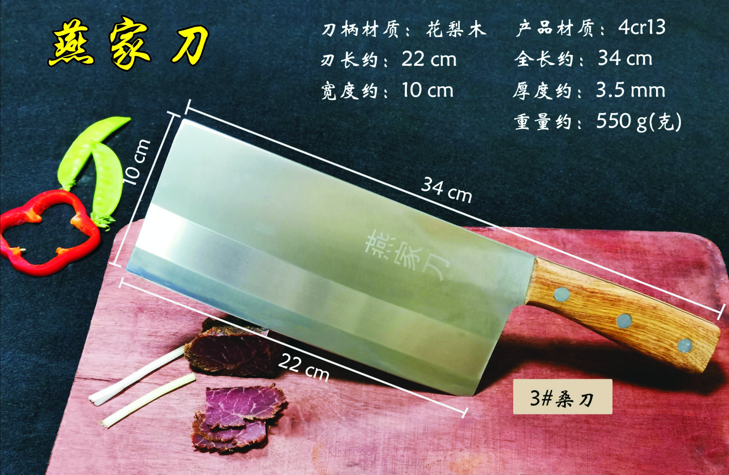 樂山燕家刀具有限公司(公司前身為燕佳鐵匠鋪),公司坐落于美麗的佛都之鄉(xiāng)樂山嘉州,在全國各地有上千家代理經(jīng)銷點,公司專業(yè)銷售、設計、制作各類刀具。秉承一貫鍛造三精要求,即選料精、用料精、工藝精。所選材料全部產(chǎn)自滇東鐵礦優(yōu)產(chǎn)區(qū)。本品牌刀具堅持千挑萬選為材,千錘百煉為刀的手工鍛造工藝宗旨。具有鋒利耐磨、持久耐用,用料上乘,硬度高、韌度強的特點!